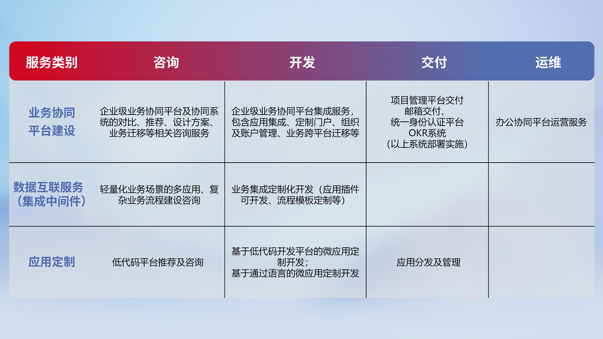 针对钉钉、、企微、、IDaas等平台级产品提供产品的规划、、方案、、、、交付、、、、定制化开发等服务,,实现如统一协同办公、、、、智能客户服务、、混合会议管理、、、、智能数据查询、、、、等业务场景,,,,实现数字化转型。。。。